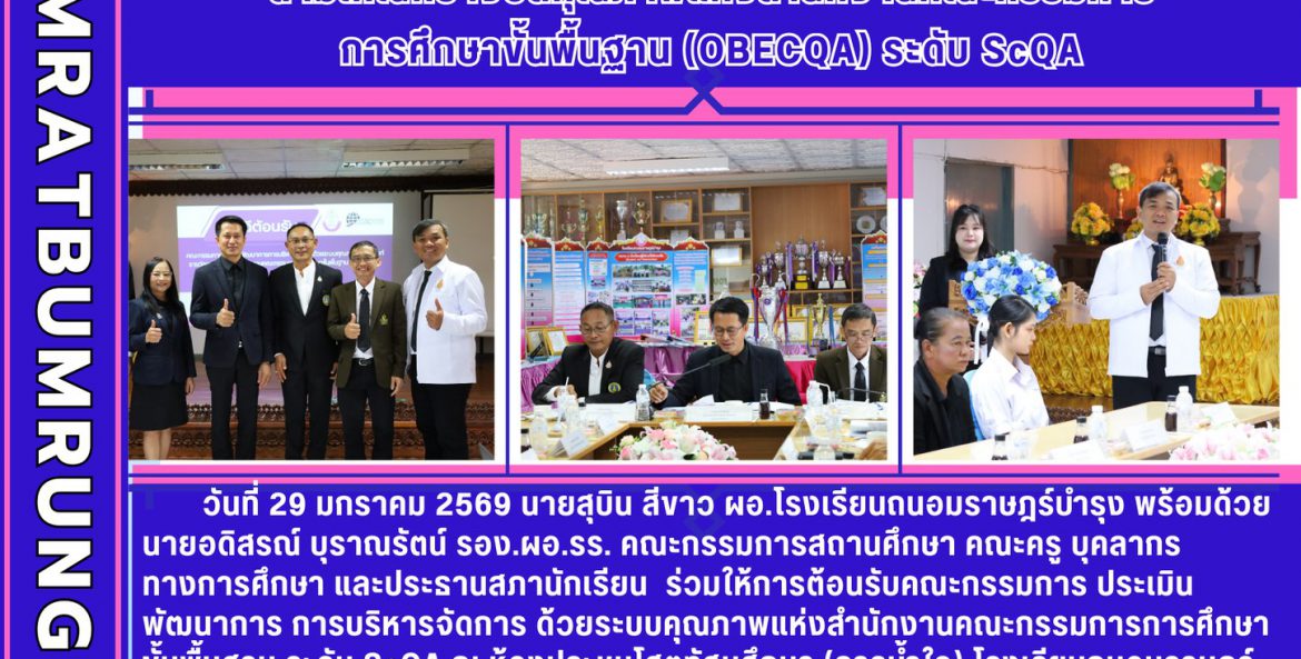 วันที่ 29 มกราคม 2569 นายสุบิน สีขาว ผอ.โรงเรียนถนอมราษฎร์บำรุง พร้อมด้วยนายอดิสรณ์ บุราณรัตน์ รอง.ผอ.รร. คณะกรรมการสถานศึกษา คณะครู บุคลากรทางการศึกษา และประธานสภานักเรียน ร่วมให้การต้อนรับคณะกรรมการ ประเมินพัฒนาการ การบริหารจัดการ ด้วยระบบคุณภาพแห่งสำนักงานคณะกรรมการการศึกษาขั้นพื้นฐาน ระดับ ScQA ณ ห้องประชุมโสตทัศนศึกษา (ธารน้ำใจ) โรงเรียนถนอมราษฎร์บำรุง