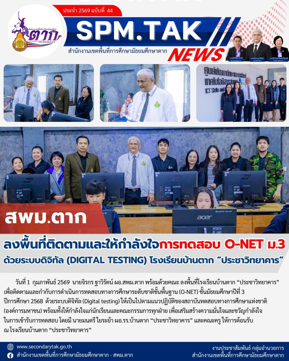 ลงพื้นที่ติดตามและให้กำลังใจการทดสอบ O-NET ม3 ด้วยระบบดิจิทัล (DIGITAL TESTING) โรงเรียนบ้านตาก”ประชาวิทยาคาร” วรวุฒิ เนื้อนิ่ม 2 กุมภาพันธ์ 2569 จำนวนคนดู 1