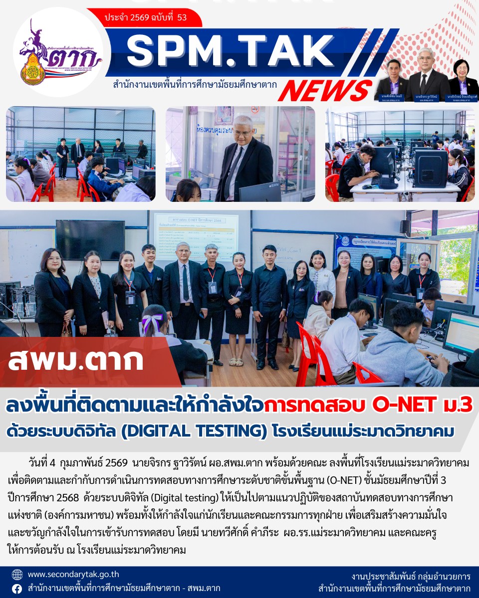 ลงพื้นที่ติดตามและให้กำลังใจการทดสอบ O-NET ม3 ด้วยระบบดิจิทัล (DIGITAL TESTING) โรงเรียนแม่ระมาดวิทยาคม วรวุฒิ เนื้อนิ่ม 5 กุมภาพันธ์ 2569 จำนวนคนดู 0