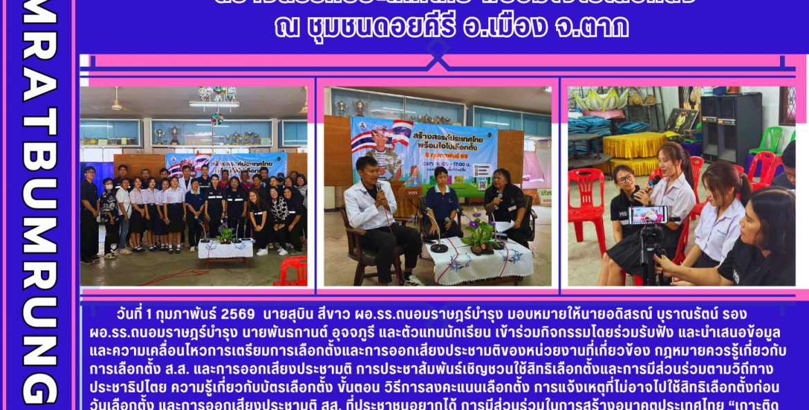 วันที่ 1 กุมภาพันธ์ 2569 นายสุบิน สีขาว ผอ.รร.ถนอมราษฎร์บำรุง มอบหมายให้นายอดิสรณ์ บุราณรัตน์ รองผอ.รร.ถนอมราษฎร์บำรุง นายพันธกานต์ อุจจภูรี และตัวแทนนักเรียน เข้าร่วมกิจกรรมโดยร่วมรับฟัง และนำเสนอข้อมูลและความเคลื่อนไหวการเตรียมการเลือกตั้งและการออกเสียงประชามติของหน่วยงานที่เกี่ยวข้อง กฎหมายควรรู้เกี่ยวกับการเลือกตั้ง ส.ส. และการออกเสียงประชามติ