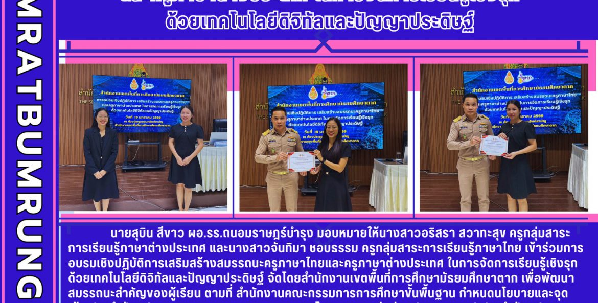 นายสุบิน สีขาว ผอ.รร.ถนอมราษฎร์บำรุง มอบหมายให้นางสาวอริสรา สวาทะสุข ครูกลุ่มสาระการเรียนรู้ภาษาต่างประเทศ และนางสาวจันทิมา ชอบธรรม ครูกลุ่มสาระการเรียนรู้ภาษาไทย เข้าร่วมการอบรมเชิงปฏิบัติการเสริมสร้างสมรรถนะครูภาษาไทยและครูภาษาต่างประเทศ ในการจัดการเรียนรู้เชิงรุกด้วยเทคโนโลยีดิจิทัลและปัญญาประดิษฐ์