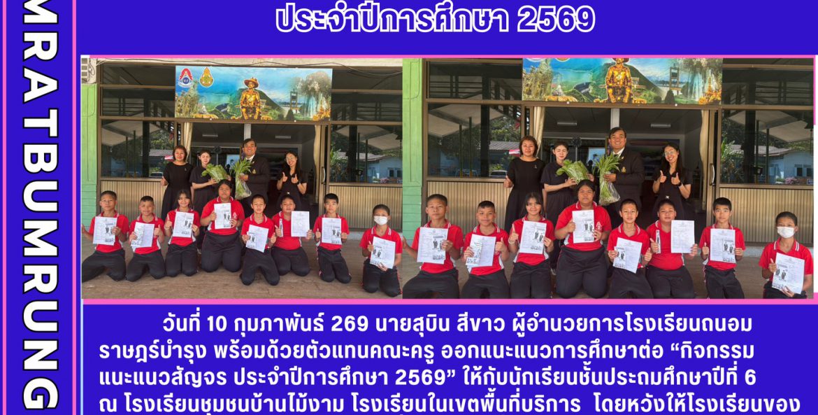 วันที่ 10 กุมภาพันธ์ 269 นายสุบิน สีขาว ผู้อำนวยการโรงเรียนถนอมราษฎร์บำรุง พร้อมด้วยตัวแทนคณะครู ออกแนะแนวการศึกษาต่อ “กิจกรรมแนะแนวสัญจร ประจำปีการศึกษา 2569” ให้กับนักเรียนชั้นประถมศึกษาปีที่ 6 ณ โรงเรียนชุมชนบ้านไม้งาม โรงเรียนในเขตพื้นที่บริการ โดยหวังให้โรงเรียนของเราเป็นอีกหนึ่งทางเลือกของเด็กๆที่มีความมุ่งมั่นในด้านกีฬา และห้องเรียนอาชีพ