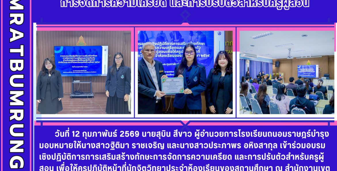 วันที่ 12 กุมภาพันธ์ 2569 นายสุบิน สีขาว ผู้อำนวยการโรงเรียนถนอมราษฎร์บำรุง มอบหมายให้นางสาวฐิติมา ราชเจริญ และนางสาวประภาพร อหิงสากุล เข้าร่วมอบรมเชิงปฏิบัติการการเสริมสร้างทักษะการจัดการความเครียด และการปรับตัวสำหรับครูผู้สอน เพื่อให้ครูปฎิบัติหน้าที่นักจิตวิทยาประจำห้องเรียนของสถานศึกษา ณ สำนักงานเขตพื้นที่การศึกษามัธยมศึกษาตาก