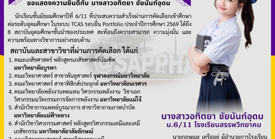 โรงเรียนสรรพวิทยาคม : นักเรียนสรรพวิทยาคมสร้างชื่อ คว้า ๘ ที่นั่ง TCAS รอบ Portfolio สายวิทยาศาสตร์–สุขภาพ–วิศวกรรม นิรมล พิพัฒน์คุปติกุล 28 กุมภาพันธ์ 2569 จำนวนคนดู 0