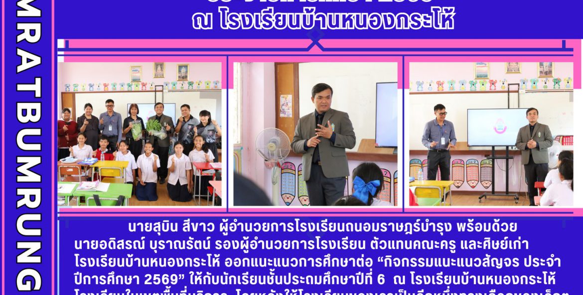 นายสุบิน สีขาว ผู้อำนวยการโรงเรียนถนอมราษฎร์บำรุง พร้อมด้วย นายอดิสรณ์ บุราณรัตน์ รองผู้อำนวยการโรงเรียน ตัวแทนคณะครู และศิษย์เก่าโรงเรียนบ้านหนองกระโห้ ออกแนะแนวการศึกษาต่อ “กิจกรรมแนะแนวสัญจร ประจำ ปีการศึกษา 2569” ให้กับนักเรียนชั้นประถมศึกษาปีที่ 6 ณ โรงเรียนบ้านหนองกระโห้ โรงเรียนในเขตพื้นที่บริการ โดยหวังให้โรงเรียนของเราเป็นอีกหนึ่งทางเลือกของเด็กๆที่มีความมุ่งมั่นในด้านกีฬา และห้องเรียนอาชีพ