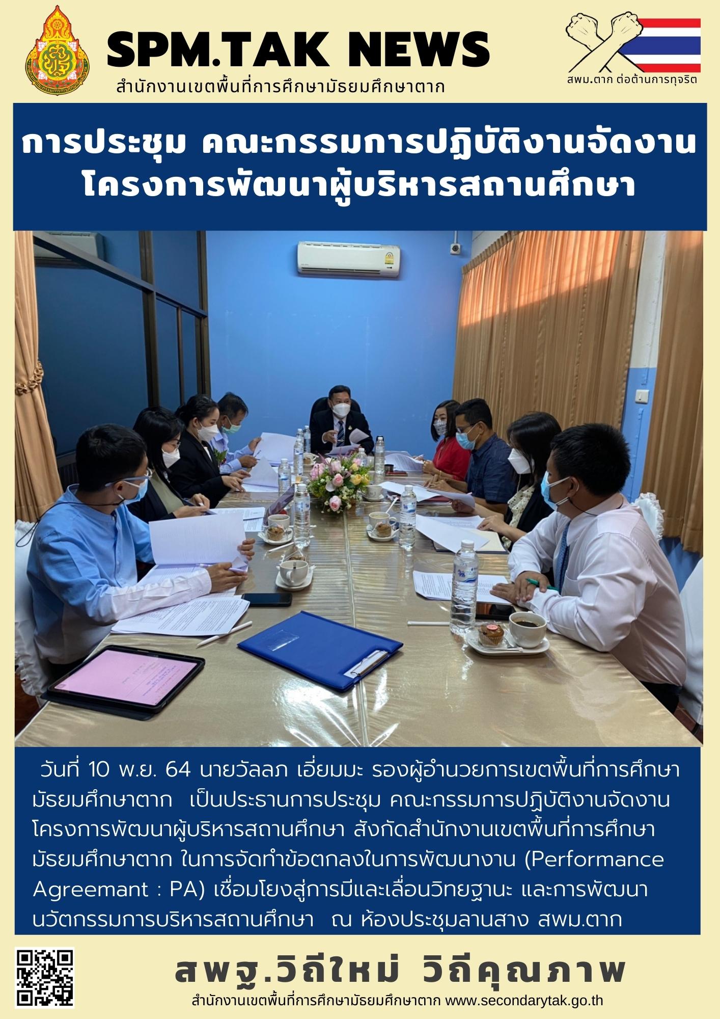 วันที่ 10 พ.ย. 2564 นายวัลลภ เอี่ยมมะ รองผู้อำนวยการเขตพื้นที่การศึกษามัธยมศึกษาตาก เป็นประธานการประชุม คณะกรรมการปฏิบัติงานจัดงานโครงการพัฒนาผู้บริหารสถานศึกษา สังกัดสำนักงานเขตพื้นที่การศึกษามัธยมศึกษาตาก ในการจัดทำข้อตกลงในการพัฒนางาน (Performance Agreemant : PA) เชื่อมโยงสู่การมีและเลื่อนวิทยฐานะ และการพัฒนานวัตกรรมการบริหารสถานศึกษา ณ ห้องประชุมลานสาง สพม.ตาก